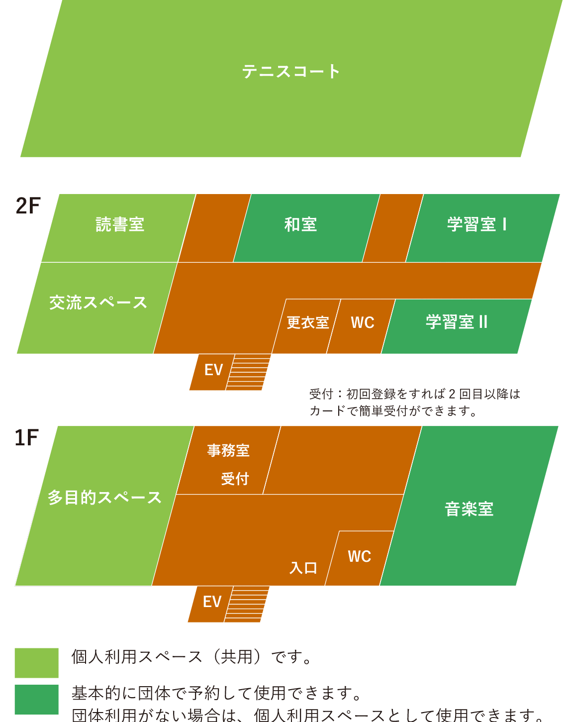 中学生以上の若者は、自由利用の手続きをすると、団体による予約利用のない時間に個人でも音楽室、学習室Ⅰ・Ⅱ、屋上テニスコートを利用することができます。