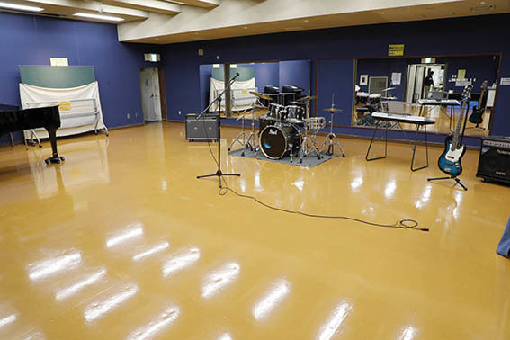 音楽のほかにも、ダンス、演劇など多目的な用途で利用できる音楽室。ドラムやエレキギターなど楽器の貸し出しもしています。