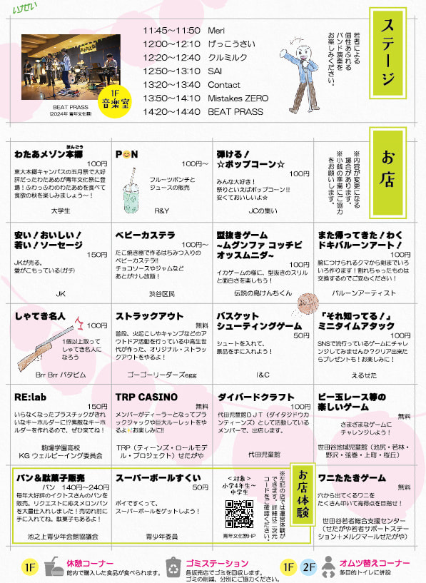 HOME | 青年文化祭 青年文化祭11月3日(月・祝)に開催決定! 2025キャスト募集‼出店サポート・音響など興味のある分野に参加してみませんか?対象:中学生以上の若者活動日:(当日)11月3日(月・祝)11:00~15:00関心のある人はユースワーカーへ声をかけてね! ちらしが完成しました! ARTWORK BY ゆっぴー(中学生) ▼こちらからダウンロードもできます。 青年文化祭開催チラシ